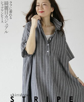 【再入荷8月31日20時より】 シャツワンピース レディース グレー 春 夏 秋 ミモレ丈 5分袖 ドロップショルダー 総柄 ストライプ 落ち感 体型カバー おしゃれ カジュアル ラフに着れる。綺麗目カジュアルシャツワンピース 6/13[5]