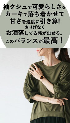 【再入荷9月4日10時より】 トップス プルオーバー レディース カーキ 春 夏 秋 五分袖 異素材 ドッキング 袖コンシャス ドロップショルダー ギャザー おしゃれ 辛口テイストだから使いやすい袖クシュ異素材トップス 5/25