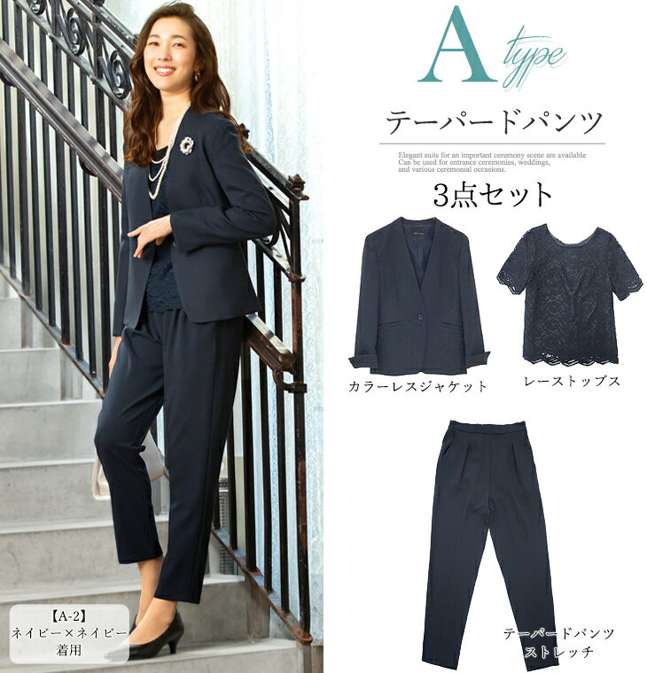 セレモニー対応パンツスーツについてデザインが選べるジャケットとストレッチ素材のレース生地トップス&パンツのアンサンブルセットです。