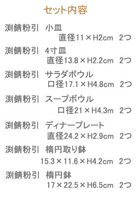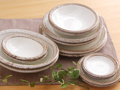 セット内容 渕錆粉引シリーズ 小皿 ×2 4寸皿 ×2 サラダボウル ×2 スープボウル ×2 ディナープレート ×2 楕円取り鉢 ×2 楕円鉢 ×2 商品詳細 素材/磁器 質感/つややか 生産地/日本(美濃焼) 電子レンジ、食器洗い機使用可 オーブン(直火)不可 ご注意 ※渕部分の茶色の濃淡がそれぞれ異なります。