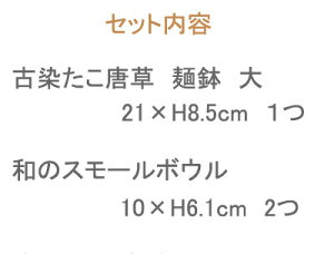 セット内容 ・古染たこ唐草 麺鉢 大 ×1 ・和のスモールボウル 黒ゆず ×2 商品詳細 素材/・麺鉢:磁器 ・和のスモールボウル:陶器 生産地/日本(美濃焼) 電子レンジ、食器洗い機使用可 オーブン(直火)不可 他の商品と同梱可能 ラッピング不可 ※左記のサイズは全て外寸になります。