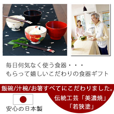 (有料+100円(税抜き) サイズ 飯碗:約径11×高さ6.5cm 汁椀:約径10.8×7.2cm お箸:山茶花 約21.5cm/ 木蓮 約23cm ●下記の用途でおすすめ 各種記念品、ギフト、プレゼントとして、オリジナリティのある商品をご提供致します。
