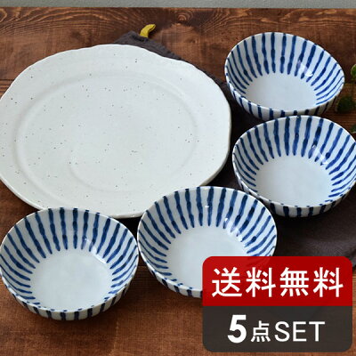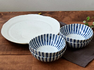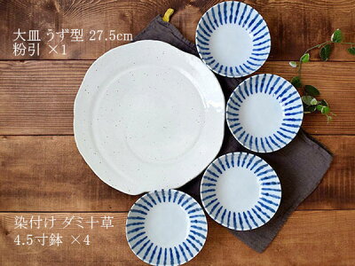 セット内容 ・うず大皿 粉引 27.5cm皿 ×1 ・染付けダミ十草 4.5寸鉢 ×4 商品詳細 [大皿うず型] サイズ/27.5×27×高さ3.5cm 重さ/約930g(商品により誤差があります) [小鉢ダミ十草] サイズ/口径13.7×13.7×高さ5.4cm 重さ/約237g(商品により誤差があります。