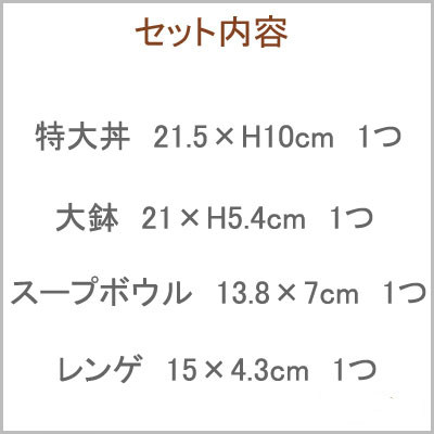 セット内容 ・特大丼 ×1 ・大鉢 ×1 ・スープボウル ×1 ・レンゲ ×1 商品詳細 素材/磁器 (スープボウル:PET・ABS樹脂) 生産地/日本(美濃焼) 電子レンジ、食器洗い機使用可 オーブン(直火)不可 ご注意 ※他の商品と同梱可能です。