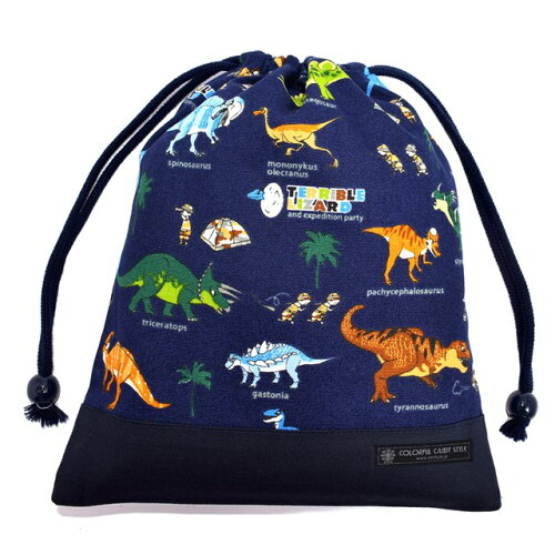 【クーポン利用で5%OFF】【ゆうパケット配送】巾着 中 マチ無し給食袋 (ネームタグ付き) 発見!探検!恐竜大陸 (ネイビー) 子供用 巾着袋 中 小学校 お 袋 袋 給食 袋 小学生 入学 道具袋 巾着 マチ 幼稚園 かわいい 入園準備 入園グッズ