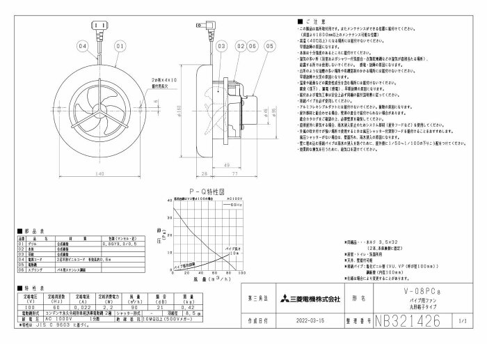 三菱電機 V-08PC8 パイプ用ファン 居室・トイレ・洗面所用 丸形格子グリル 電源コード(プラグ付)