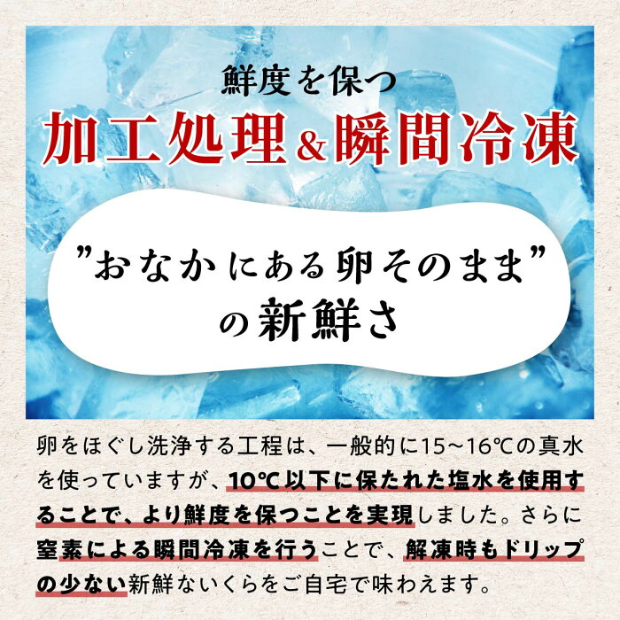 その卵を大人気の『北海道海鮮紀行いくら』と同じく、窒素による急速冷凍をし、パック内の空気を窒素に置換えることにより酸化を防止し、「鮮度保持」と「品質保持」を追求した製法により製造しています。