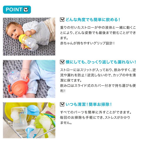 持ちやすいグリップと軽い本体で、寝ころんだままでも飲むことができるので、哺乳瓶からの移行もスムーズです。